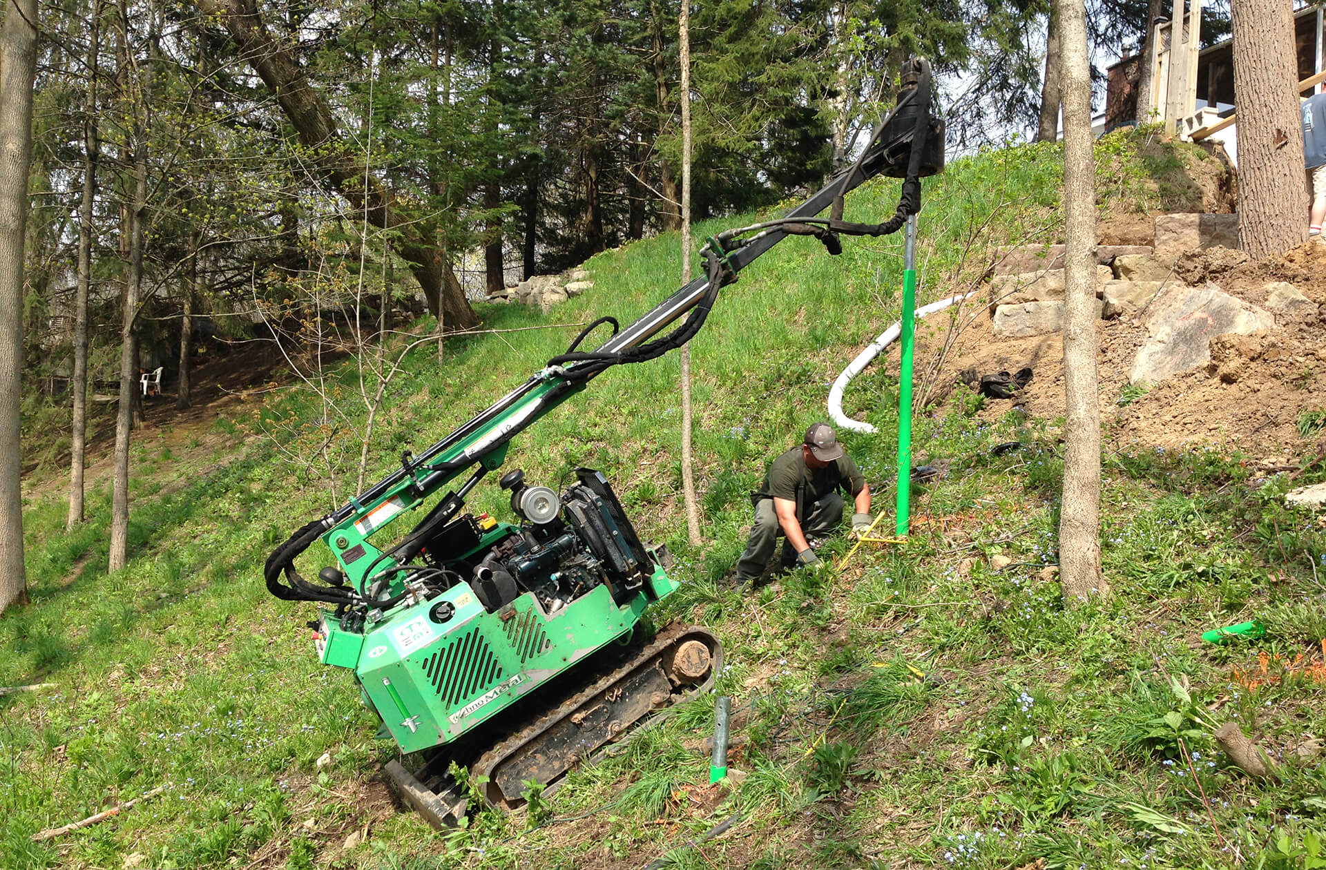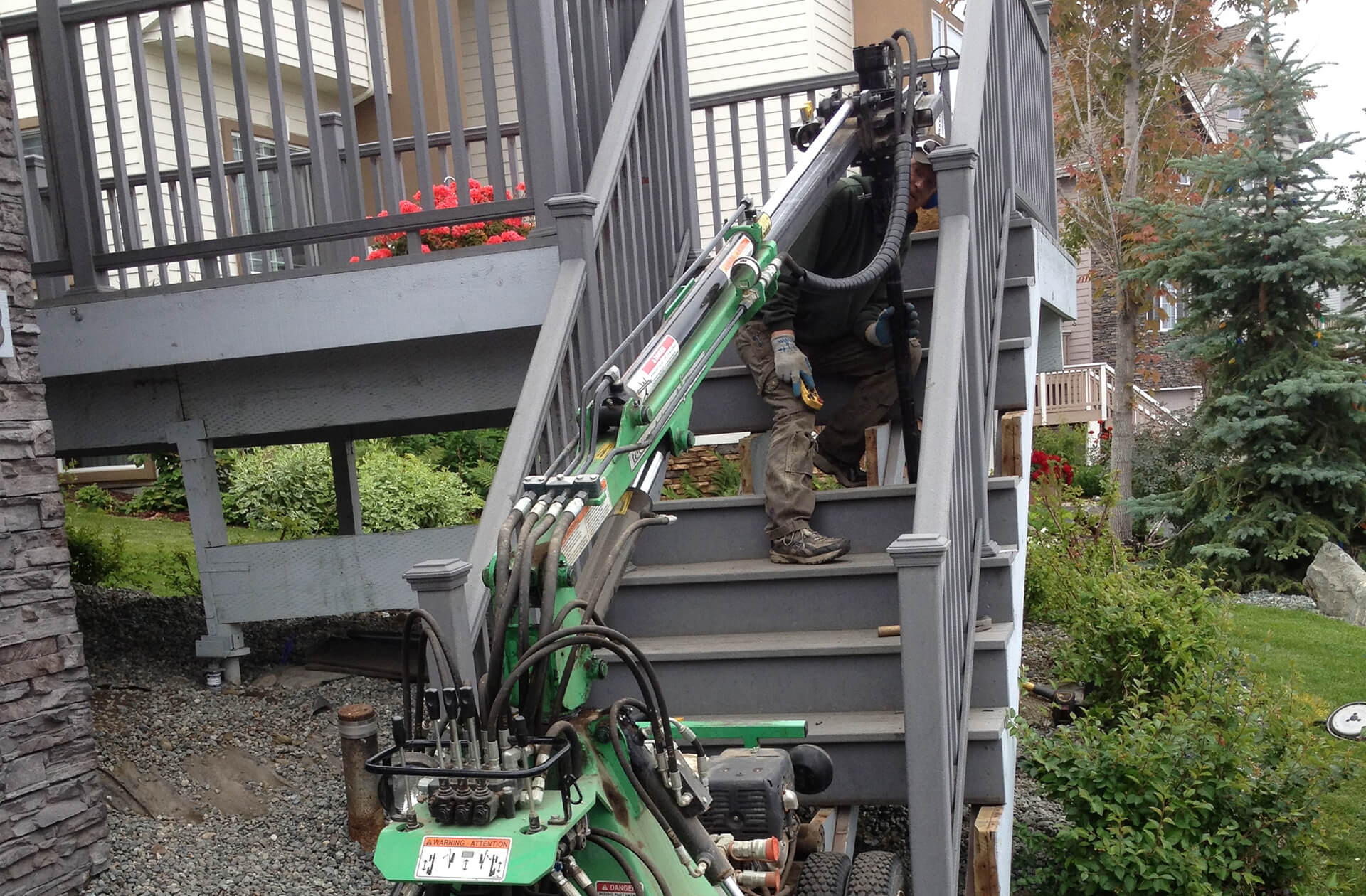 Need repairs or structural reinforcement beneath your deck? Our equipment can install piers below most standard deck spaces as low as 36 inches from the ground. No deck removal required to perform precise foundation work!